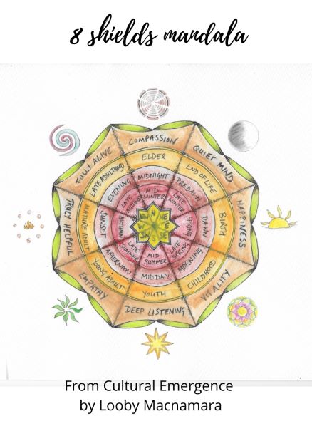 The 8 Shields model is explored in depth in Cultural Emergence, with reference to how to develop each attribute of connection. Each direction has activities to guide us in connecting to ourselves, each other and the more than human world.